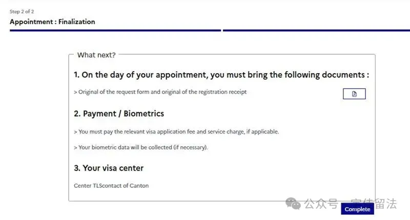 至此,您已完成France-Visas网站上的所有填表流程,将无法再修改信息。系统将自动生成所需材料清单及签证申请费用(此费用不包含签证中心服务费)。